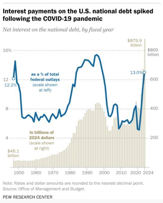隨著債臺(tái)越筑越高,美國政府2024財(cái)年支付的凈債息已達(dá)到8799億美元,占當(dāng)年財(cái)政總支出的13%,不僅創(chuàng)下25年來的最高比例,而且超過了醫(yī)保支出(8741億美元)和軍費(fèi)支出(8735億美元)。