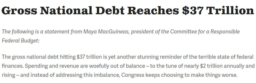 “(美國)國家債務(wù)總額達(dá)到37萬億美元的現(xiàn)實(shí)再次令人震驚地凸顯出聯(lián)邦財(cái)政的糟糕狀況。支出和收入嚴(yán)重失衡每年造成近2萬億美元的財(cái)政赤字,然而美國國會(huì)不僅沒有解決這種財(cái)政失衡,反而一直選擇讓事情變得更糟?!?/p>