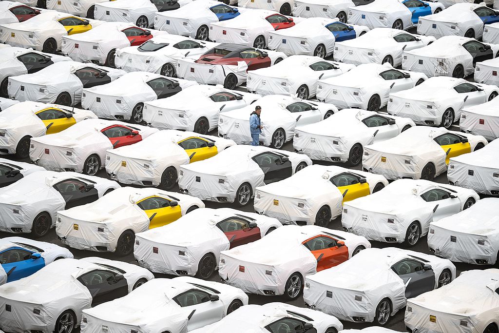 當(dāng)?shù)貢r間2025年4月11日,日本橫濱大黑碼頭,停放著新車。