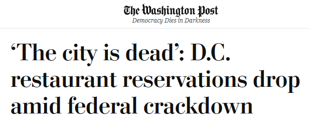 用當?shù)夭宛^老板的話說,“看到執(zhí)法人員在社區(qū)里巡視我們的建筑、往窗戶里看,無疑讓顧客和員工都很緊張?!?/strong>特朗普宣布由聯(lián)邦政府接管首都治安的當天,華盛頓餐廳的在線預訂量較去年同期下降16%。此后,預訂量幾乎每天都在下滑,單日同比降幅最高達31%。