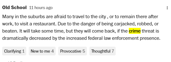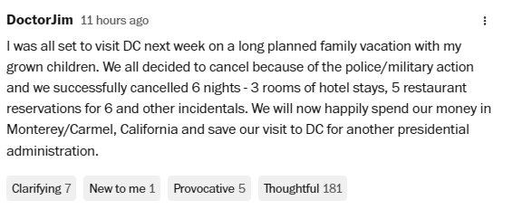 一位網(wǎng)友寫道,他因為軍警管制而取消了去首都的旅程,原本他和家人打算在華盛頓特區(qū)住6晚,在旅館定了3間房,在餐廳提前定了5頓6人餐,但這些消費都被取消了。 另一位網(wǎng)友則認為,導致人們不敢去首都的原因是當?shù)氐脑愀庵伟?,如果政府真能靠強硬?zhí)法把犯罪率打下來,那游客自然會回到華盛頓特區(qū)。