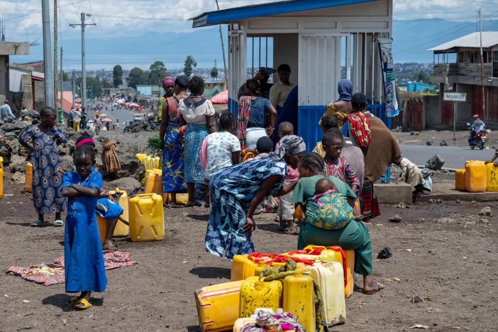 5月6日,在剛果(金)東部北基伍省戈馬市郊,流離失所者在原營(yíng)地附近的一處取水點(diǎn)等待取水。新華社記者鄭揚(yáng)子攝