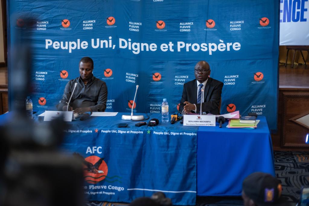 7月3日,剛果(金)反政府武裝“M23運(yùn)動(dòng)”對(duì)話代表姆博寧帕(右)出席在戈馬舉行的記者會(huì)。新華社發(fā)(扎內(nèi)姆·內(nèi)蒂·扎伊迪攝)