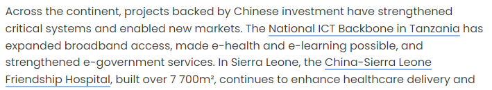 文章說,中國在非洲投資支持的項目夯實了關(guān)鍵系統(tǒng)根基,催生了新興市場。文章舉例說,坦桑尼亞的國家信息通信技術(shù)寬帶骨干網(wǎng)項目顯著拓寬了寬帶覆蓋范圍,讓線上醫(yī)療和線上學習成為可能,并強化了電子政務服務體系;塞拉利昂的中塞友好醫(yī)院持續(xù)提升當?shù)氐尼t(yī)療服務水平,在抗擊埃博拉疫情期間發(fā)揮了關(guān)鍵作用……文章說,這些項目的故事或許不會成為西方媒體的頭條新聞,但它們實實在在提振了市場,培養(yǎng)了勞動技能,為非洲企業(yè)的蓬勃發(fā)展創(chuàng)造了條件。