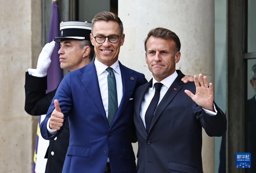 9月4日,在法國首都巴黎的總統(tǒng)府愛麗舍宮,法國總統(tǒng)馬克龍(右)迎接出席“志愿聯(lián)盟”線上會議的芬蘭總統(tǒng)斯圖布。新華社記者 高靜 攝