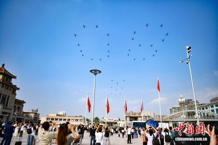 為此次閱兵活動感到激動的不只是阿麗娜?!督袢瞻突固箞蟆穲蟮婪Q,當(dāng)天,北京居民紛紛走上街頭,一睹壯觀的飛行表演。數(shù)十架直升機(jī)匯成“80”字樣,還有直升機(jī)分別懸掛“正義必勝”“歷史必勝”“人民必勝”條幅,飛臨天安門廣場上空。