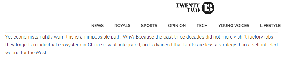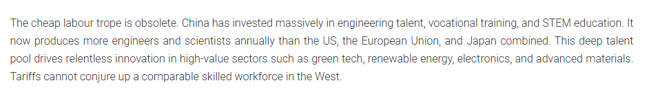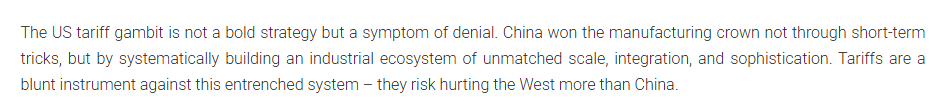 文章指出,美國的關(guān)稅策略不是一項大膽的戰(zhàn)略,而是否認(rèn)現(xiàn)實的癥狀。中國贏得制造業(yè)桂冠不是通過短期手段,而是通過系統(tǒng)地建立一個規(guī)模、一體化和復(fù)雜程度無與倫比的工業(yè)生態(tài)系統(tǒng)。