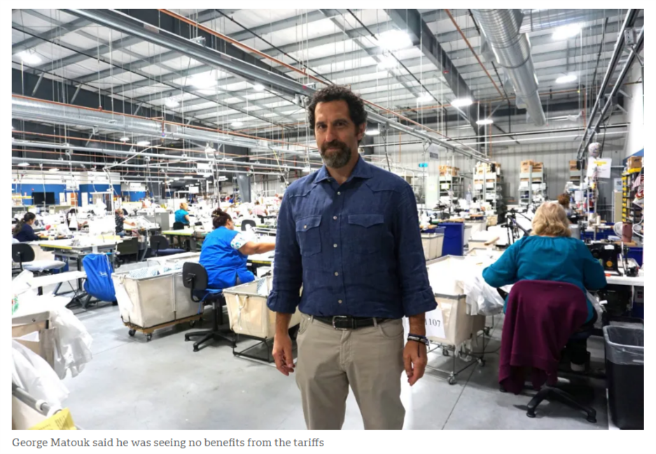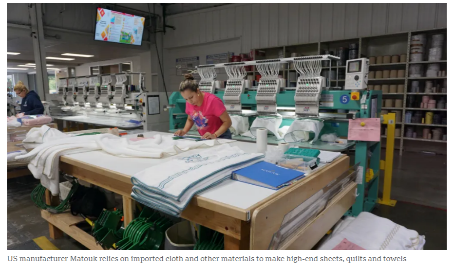 馬圖克表示,從今年4 月到 8 月,關(guān)稅導致其每月增加超過 10 萬美元的成本,因為高額關(guān)稅影響了來自印度和葡萄牙的棉布、來自列支敦士登的羽絨等原材料的供應(yīng)。不僅如此,增加的成本還迫使企業(yè)削減了在新設(shè)備以及營銷方面的開支。喬治 馬圖克說,他“沒有從關(guān)稅中看到任何好處”。