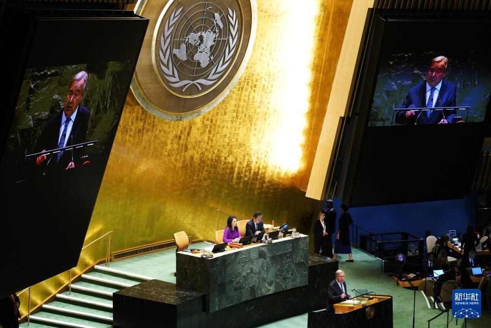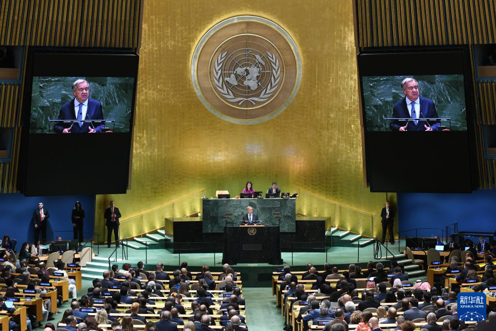 9月23日,在位于紐約的聯(lián)合國(guó)總部,聯(lián)合國(guó)秘書長(zhǎng)古特雷斯在第80屆聯(lián)合國(guó)大會(huì)一般性辯論開幕式上致辭。新華社記者李睿攝