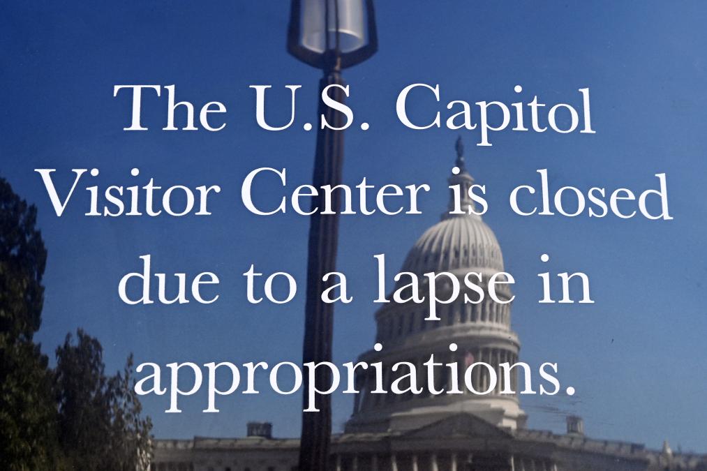 10月1日,在美國華盛頓的美國國會(huì)大廈前,公告牌顯示國會(huì)大廈游客中心關(guān)閉。新華社記者 李睿 攝