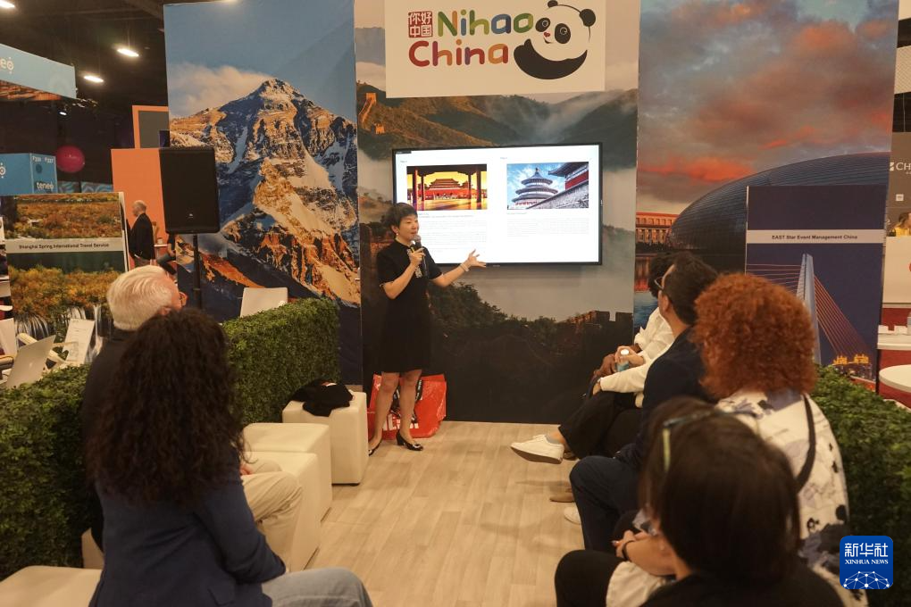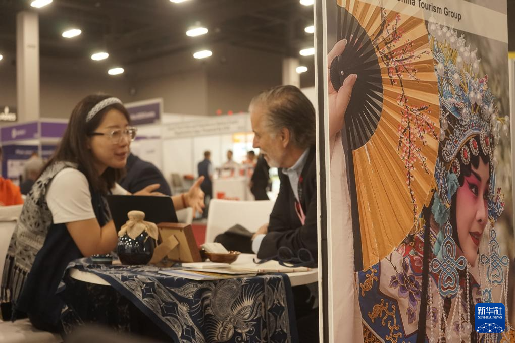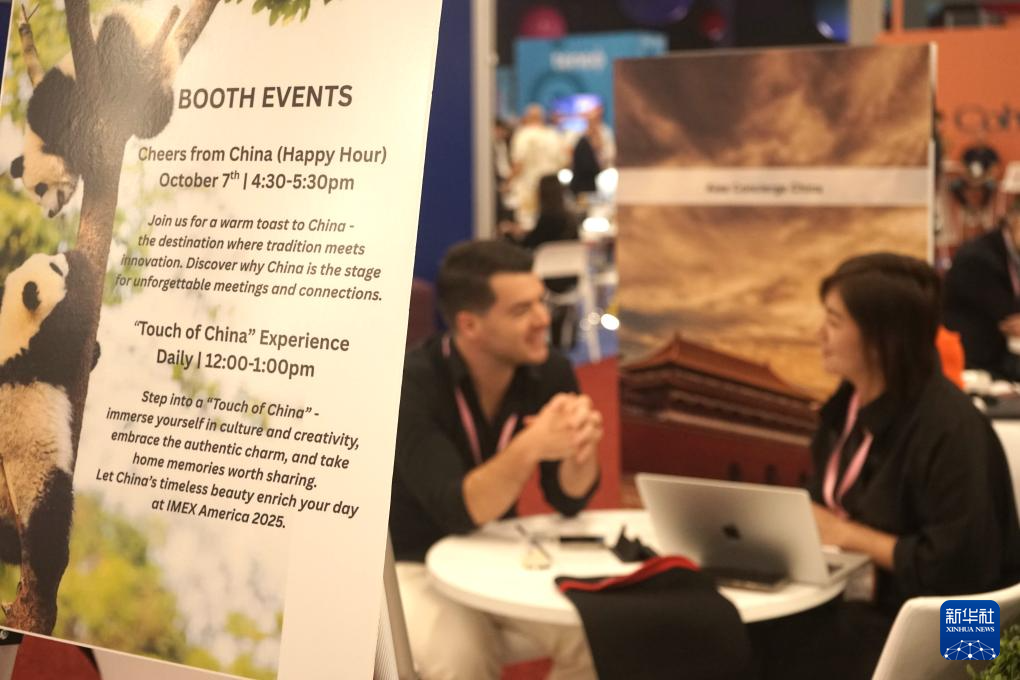 10月8日,在美國拉斯維加斯,人們?cè)?025年美國國際會(huì)議與獎(jiǎng)勵(lì)旅游展的中國展區(qū)參觀。 新華社發(fā)(曾慧攝)