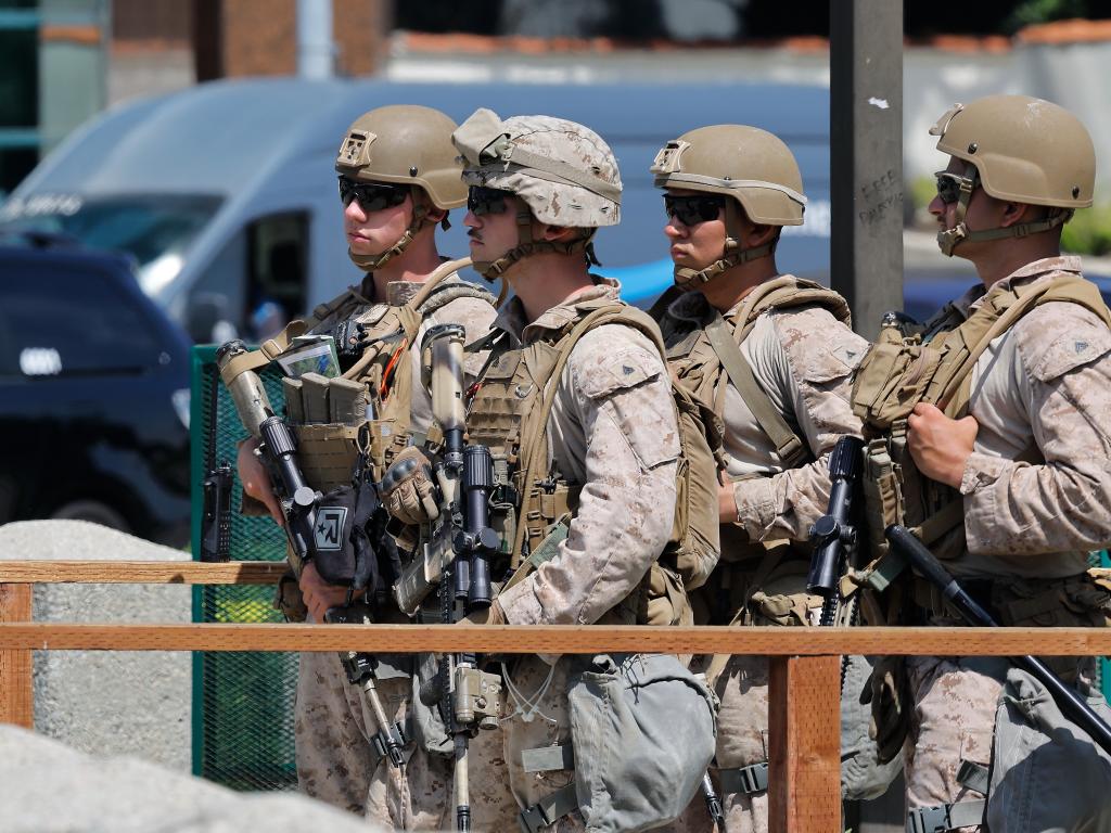 2025年6月13日,美國海軍陸戰(zhàn)隊士兵在洛杉磯威爾希爾聯(lián)邦大樓的入口處站崗。新華社發(fā)(邱晨攝)