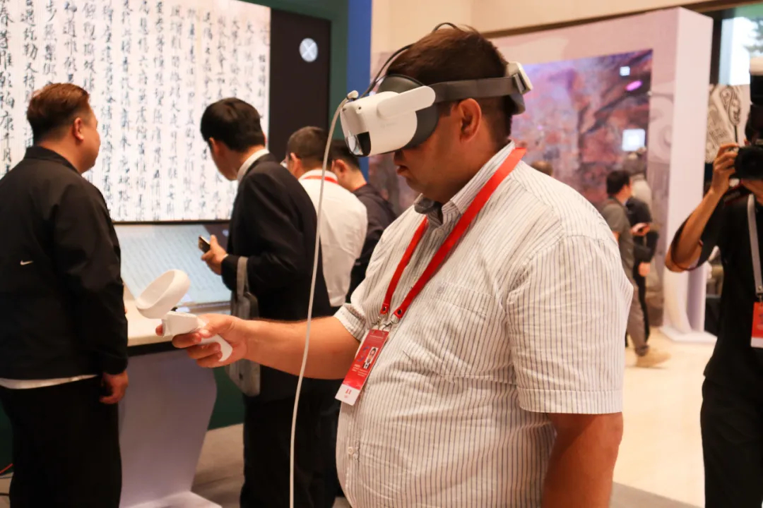 2025年9月17日,陜西西安,2025年世界互聯(lián)網(wǎng)大會(huì)文化遺產(chǎn)數(shù)字化論壇開(kāi)幕。圖為外籍參會(huì)者體驗(yàn)數(shù)字化項(xiàng)目。中新社記者 李一璠 攝