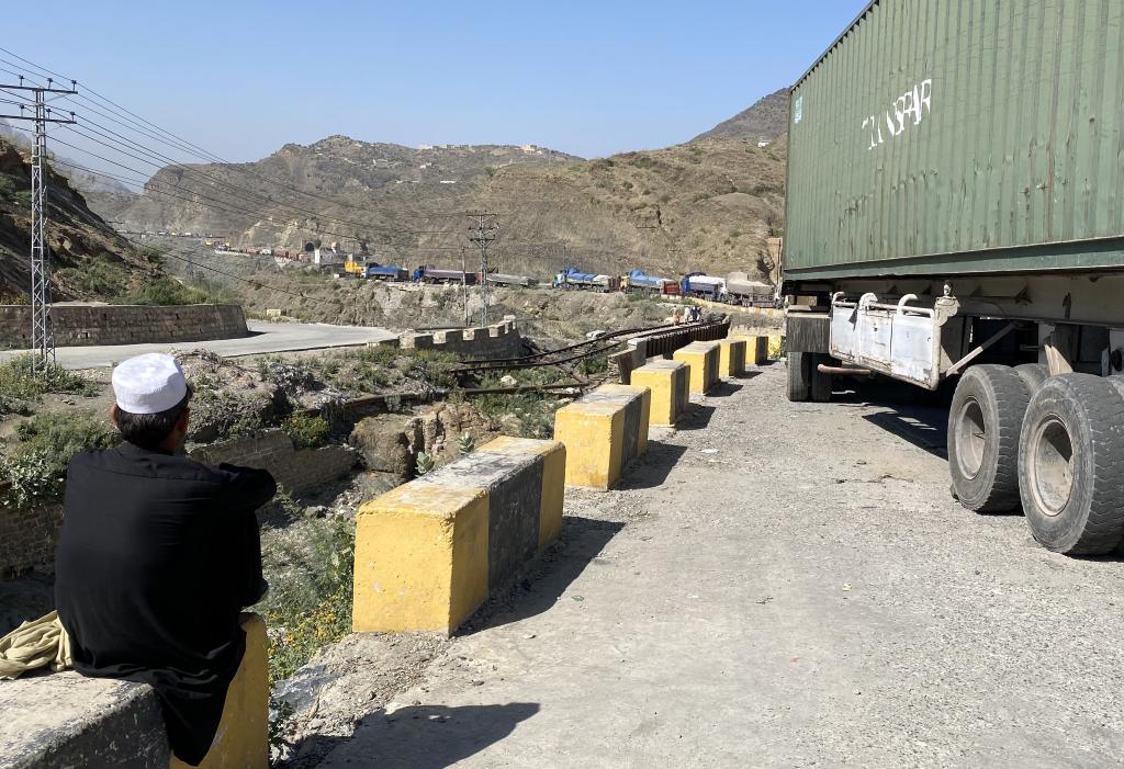10月13日,在巴基斯坦與阿富汗的邊境口岸多爾哈姆,卡車因邊境地區(qū)沖突而滯留。新華社發(fā)