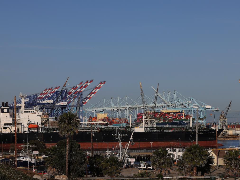 這是5月10日在美國洛杉磯港拍攝的貨船。新華社發(fā)邱晨攝
