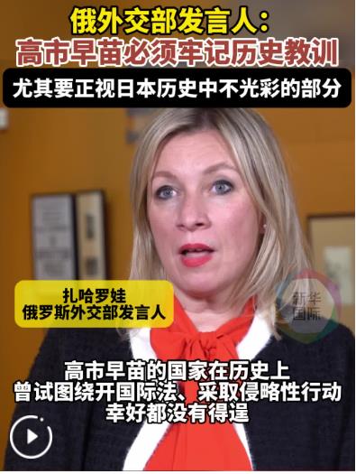 今年是世界反法西斯戰(zhàn)爭勝利80周年。扎哈羅娃指出,世界各地一系列紀念活動都在提醒世人勿忘歷史、汲取教訓。高市早苗必須牢記歷史教訓,尤其要正視本國歷史中那些不光彩的部分。
