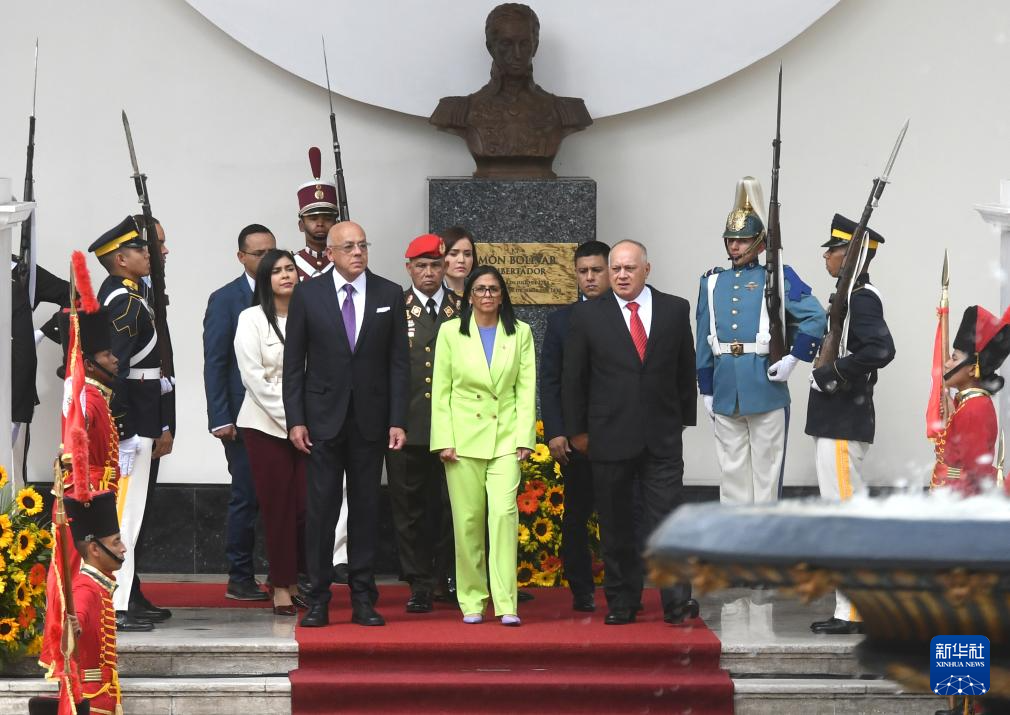 1月15日,在委內(nèi)瑞拉首都加拉加斯,委內(nèi)瑞拉代總統(tǒng)德爾西·羅德里格斯(前中)到達(dá)會(huì)場(chǎng)準(zhǔn)備發(fā)表國(guó)情咨文。新華社發(fā)(馬科斯·薩爾加多攝)