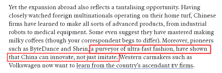 文章說,幾年前,人們還很難想象中國(guó)品牌能在美國(guó)大獲成功。然而如今,曼哈頓的購(gòu)物者可以走進(jìn)中國(guó)服裝零售商2800平方米的門店,選購(gòu)在TikTok上爆紅的潮流服飾;隨后再來一杯中國(guó)品牌的咖啡(去年登陸紐約),或一支中國(guó)連鎖品牌的冰淇淋。