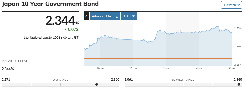 1月20日,日本長期國債在東京債券市場繼續(xù)遭到拋售,導(dǎo)致收益率不斷上揚。當(dāng)天,作為日本長期利率指標(biāo)的10年期日本國債收益率一度上升至2.330%,為1999年2月以來的最高水平。這一市場異動恰逢日本政局進(jìn)入敏感時段,引發(fā)投資者對經(jīng)濟前景的深度憂慮。
