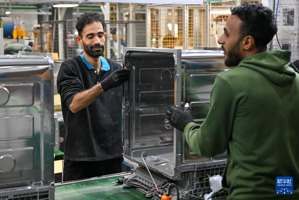 1月19日,在埃及蘇赫奈泉的中埃·泰達(dá)蘇伊士經(jīng)貿(mào)合作區(qū),埃及員工在美的埃及廚房和熱水器有限公司洗碗機(jī)生產(chǎn)車(chē)間組裝洗碗機(jī)。新華社記者 辛夢(mèng)晨 攝