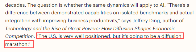 正如科技史著作《科技與大國崛起》的作者杰弗里·丁所言:“基準測試表現(xiàn)與實際生產(chǎn)力提升是兩回事。盡管美國現(xiàn)在的位置不錯,但是這是一場持久的馬拉松?!?/p>