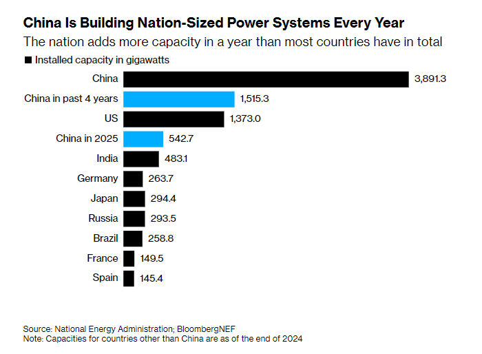 文章援引中國(guó)國(guó)家能源局日前公布的數(shù)據(jù),2025年,中國(guó)各類技術(shù)新增發(fā)電裝機(jī)容量達(dá)到543吉瓦(GW)。這一數(shù)字比截至2024年底印度全國(guó)所有發(fā)電廠的總?cè)萘窟€要高出12%。自2021年底以來(lái),中國(guó)新增的發(fā)電容量也已超過(guò)整個(gè)美國(guó)電力系統(tǒng)的總量。