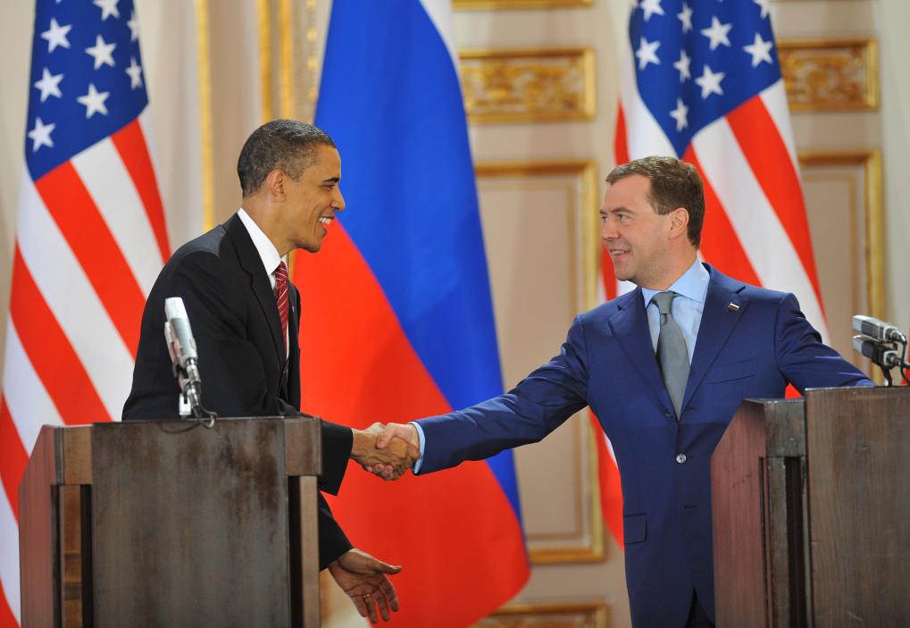 這張拍攝于2010年4月8日的資料照片顯示,時任美國總統(tǒng)奧巴馬(左)和時任俄羅斯總統(tǒng)梅德韋杰夫在捷克首都布拉格簽署新核裁軍條約后出席新聞發(fā)布會時握手。 新華社記者 武巍 攝