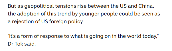 文章還說,許多創(chuàng)作“中國時(shí)刻”視頻的博主居住在美國。墨爾本大學(xué)亞洲研究院講師杜兆愷分析,年輕人的這種文化選擇或許是對(duì)美國外交政策的隱性反抗?!斑@是對(duì)當(dāng)今世界格局的回應(yīng)?!?/p>