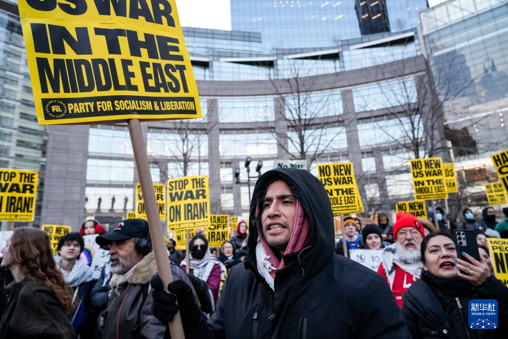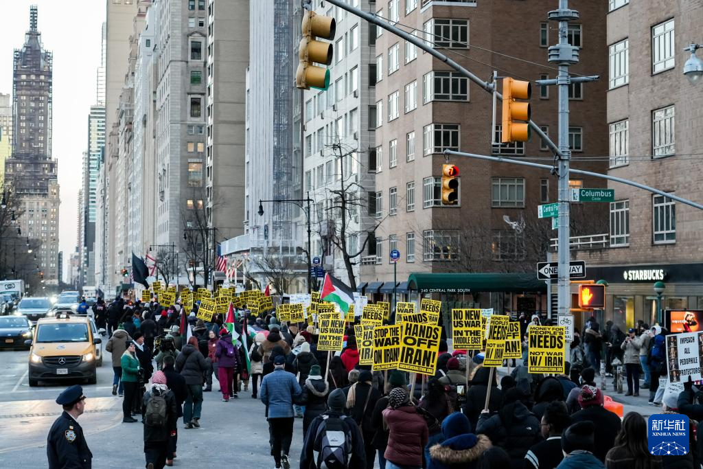 2日傍晚,數(shù)百名抗議者冒著嚴寒在紐約市哥倫布圓形廣場集會,組織方代表發(fā)表演講,人們手持標語,大聲呼喊反戰(zhàn)口號,要求“停止針對伊朗的戰(zhàn)爭”,隨后開始游行示威。