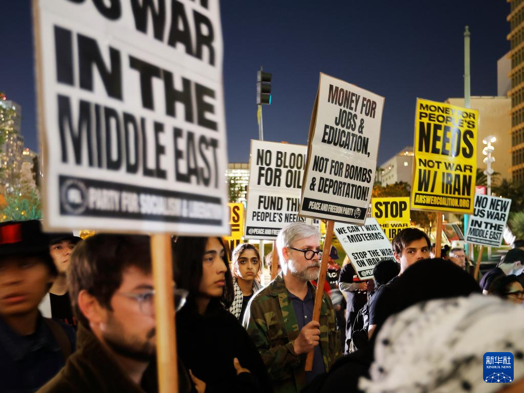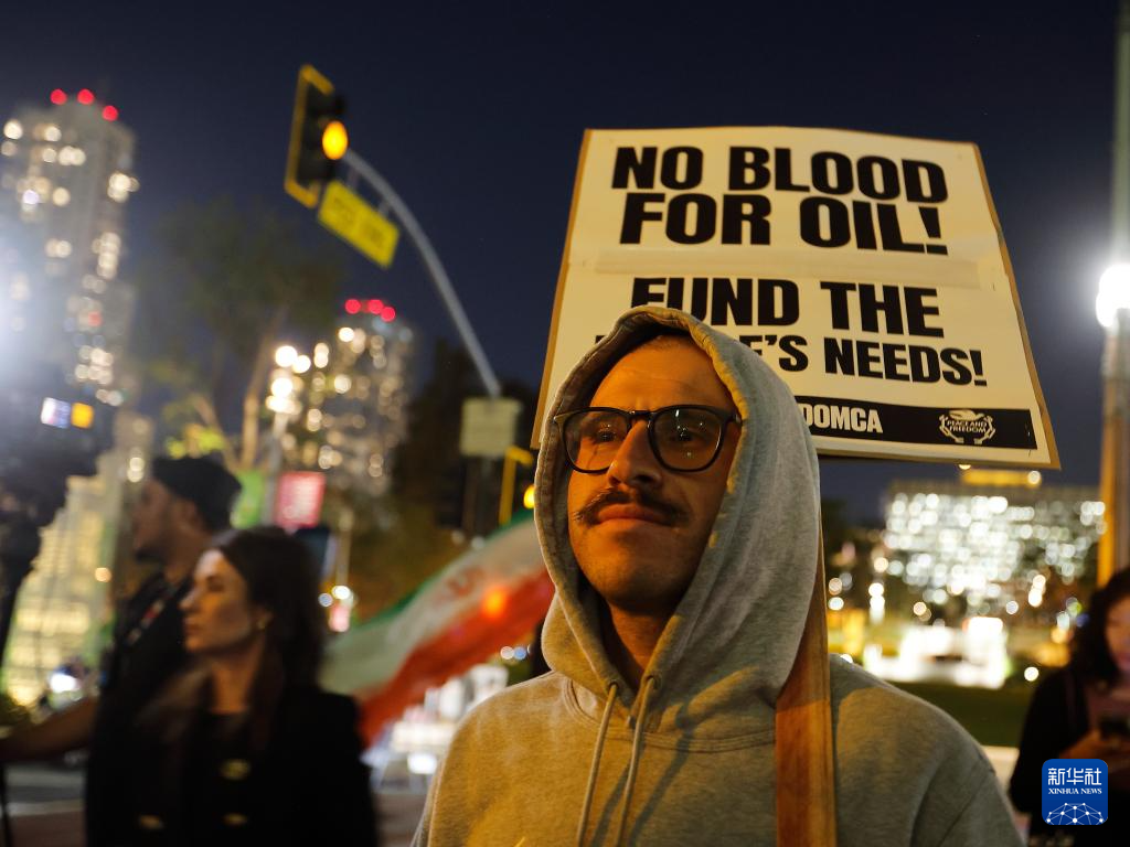 3月2日,人們在美國加利福尼亞州洛杉磯參加集會,抗議美國對伊朗發(fā)動軍事打擊。新華社發(fā)