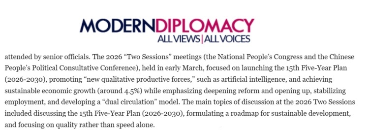 歐洲《現(xiàn)代外交》網(wǎng)站近日刊登埃及本尼蘇伊夫大學(xué)副教授納迪亞·赫爾米博士的評論文章稱,今年中國兩會重點(diǎn)關(guān)注發(fā)展模式創(chuàng)新與深化伙伴關(guān)系。會議議題包括通過共建“一帶一路”倡議推動(dòng)“高質(zhì)量發(fā)展”,深化數(shù)字經(jīng)濟(jì)、基礎(chǔ)設(shè)施及能源領(lǐng)域的國際合作,為推動(dòng)構(gòu)建人類命運(yùn)共同體提供重要平臺。