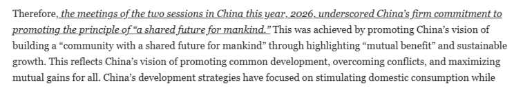 文章總結(jié)說(shuō),2026年中國(guó)兩會(huì)彰顯了中國(guó)堅(jiān)定推動(dòng)構(gòu)建人類命運(yùn)共同體原則的承諾。通過(guò)強(qiáng)調(diào)"互利共贏"和可持續(xù)增長(zhǎng),推動(dòng)構(gòu)建人類命運(yùn)共同體的愿景。這體現(xiàn)了中國(guó)推動(dòng)共同發(fā)展、化解沖突、實(shí)現(xiàn)各方利益最大化的理念。
