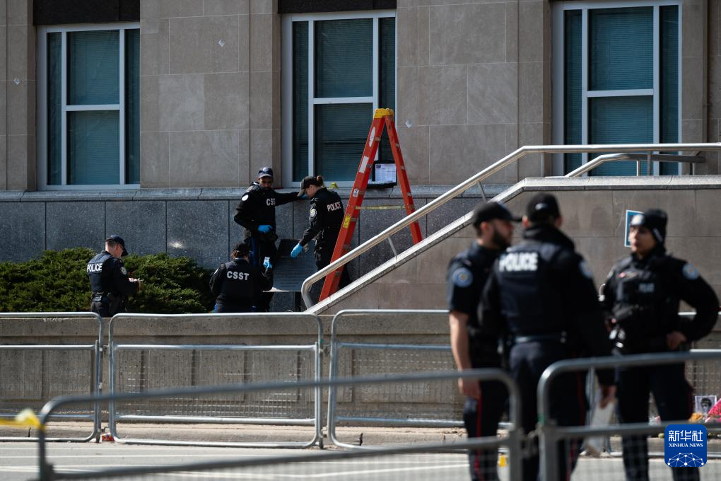 3月10日,警察在加拿大多倫多的美國駐多倫多總領(lǐng)館外對彈著點進(jìn)行拍照取證。新華社發(fā)(李海濤攝)