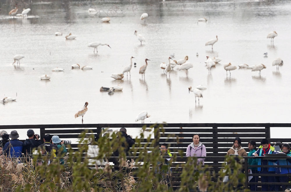 在鄱陽(yáng)湖畔的江西省南昌市白鶴小鎮(zhèn),游客與學(xué)生們近距離觀察野生白鶴(2024年12月17日攝)。