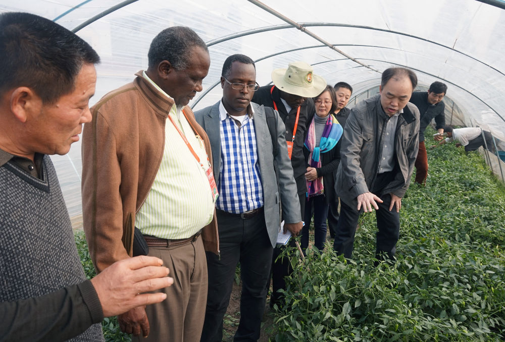 在中國(guó)江西省鄱陽(yáng)湖湖區(qū),來(lái)自非洲維多利亞湖區(qū)的學(xué)員在一處蔬菜大棚種植基地考察(2014年攝)。