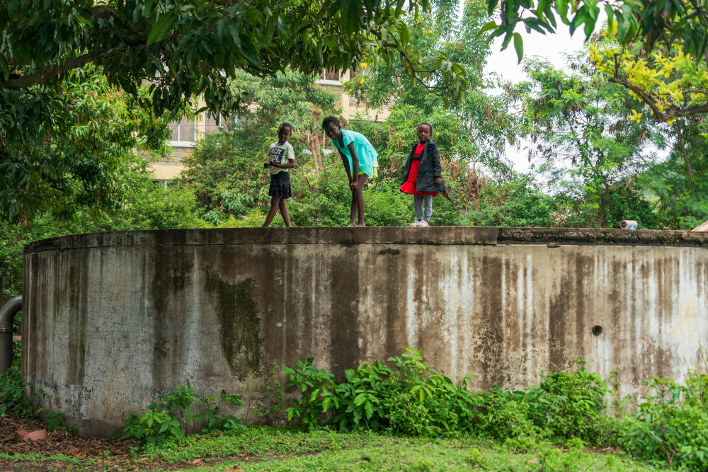 在維多利亞湖畔的肯尼亞霍馬灣,小朋友在一處儲(chǔ)水設(shè)施上玩耍(2026年3月1日攝)。