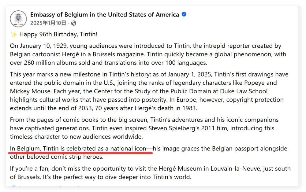 比如,在2025年1月10日比利時(shí)駐美國大使館發(fā)布的一則慶祝丁丁誕生96周年的帖文中,比利時(shí)方面就明確表示丁丁是比利時(shí)的國家標(biāo)志。