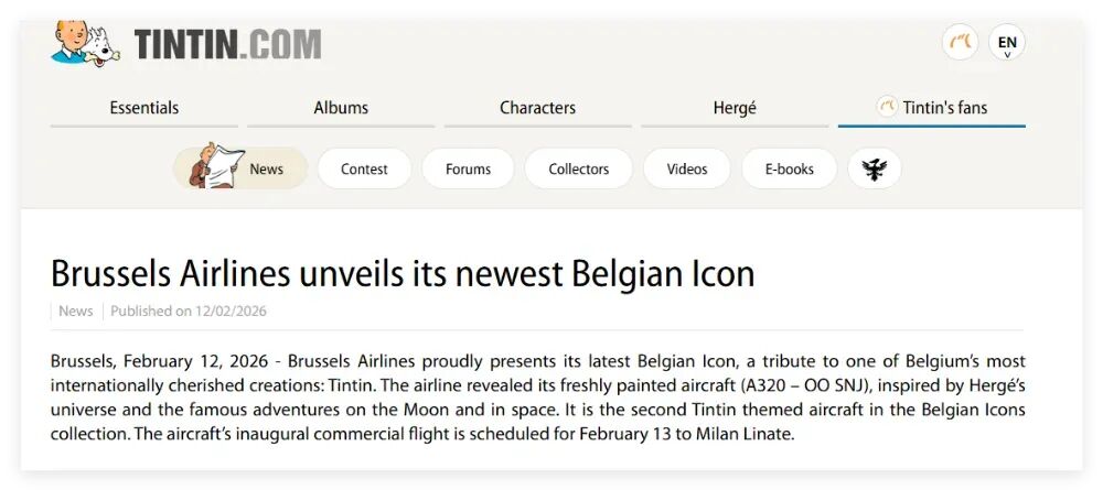 今年2月,《丁丁歷險(xiǎn)記》官網(wǎng)發(fā)布的一則關(guān)于比利時(shí)航空公司選擇將丁丁作為其客機(jī)的涂裝時(shí),亦曾寫道丁丁是比利時(shí)的標(biāo)志,而且是“比利時(shí)在國際上最受喜愛的文藝創(chuàng)作”。