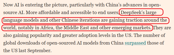 在人工智能領(lǐng)域,文章提到,以DeepSeek為代表的中國開源大模型正不斷擴(kuò)大海外影響力。憑借更低的成本與更易獲取的使用門檻,中國大語言模型在非洲、中東等新興市場受到廣泛關(guān)注。文章稱,相關(guān)模型應(yīng)用增加后,可能進(jìn)一步帶動預(yù)測性維護(hù)、數(shù)據(jù)分析和智慧基礎(chǔ)設(shè)施管理等服務(wù)需求,從而對知識密集型服務(wù)出口形成支撐。