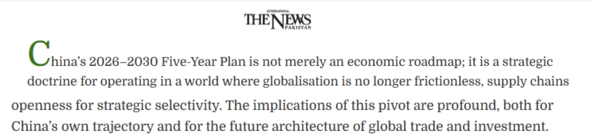 巴基斯坦《國際新聞報》近日刊文稱,“十五五”規(guī)劃綱要對中國而言不僅僅是一份經(jīng)濟路線圖,更是一項戰(zhàn)略方針。它不僅關乎中國自身的發(fā)展軌跡,也影響未來全球貿(mào)易和投資格局。
