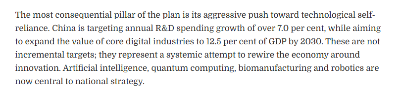 文章認為,“十五五”規(guī)劃綱要最具分量的支柱,在于對科技自立自強的強力推進。中國明確提出,研發(fā)經(jīng)費支出年均增長將超過7.0%,并力爭到2030年,核心數(shù)字經(jīng)濟產(chǎn)業(yè)增加值占GDP的比重提升至12.5%。這些并非漸進式目標,而是一場以創(chuàng)新為核心、系統(tǒng)重構(gòu)經(jīng)濟體系的戰(zhàn)略轉(zhuǎn)型。人工智能、量子計算、生物制造與機器人技術,已全面上升為國家戰(zhàn)略的核心。