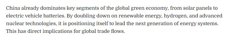 文章關注到,該規(guī)劃綱要將綠色發(fā)展置于中國經(jīng)濟轉(zhuǎn)型的核心位置。中國已在全球綠色經(jīng)濟的關鍵領域占據(jù)主導地位,從太陽能電池板到電動汽車電池,無一例外。通過加大對可再生能源、氫能以及先進核能技術的投入,中國正致力于成為下一代能源體系的引領者。這將對全球貿(mào)易格局產(chǎn)生直接影響。