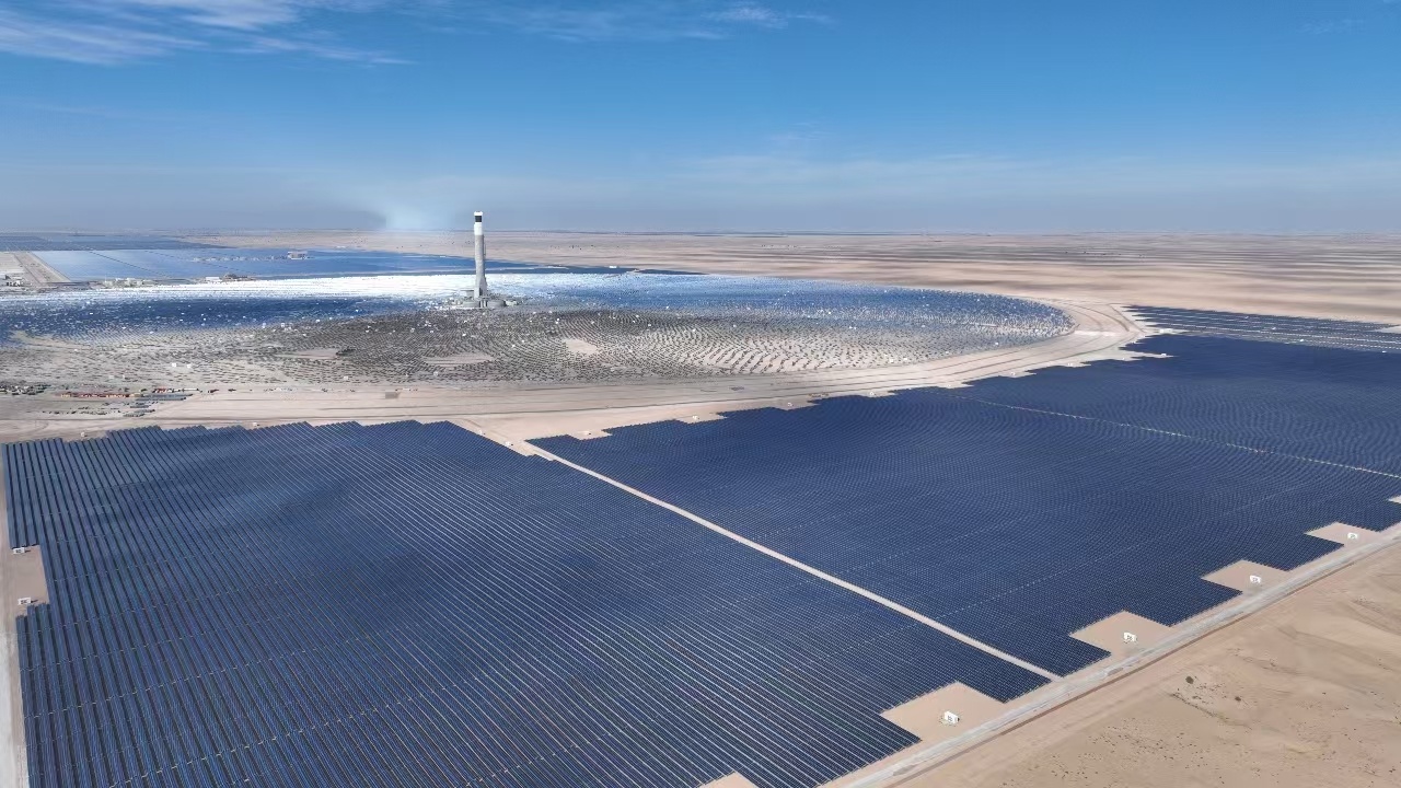 在阿拉伯聯(lián)合酋長國迪拜的沙漠深處,一片蔚藍(lán)的光伏板“海洋”在烈日下熠熠生輝:巍然聳立的262米集熱塔與周圍約7萬面定日鏡組成的巨大鏡場,共同構(gòu)成全球規(guī)模最大的光熱光伏復(fù)合電站。6000多套槽式集熱器在相當(dāng)于6000多個標(biāo)準(zhǔn)足球場面積的園區(qū)中協(xié)同運作,捕捉沙漠中充沛的太陽能,并將其源源不斷轉(zhuǎn)化為清潔電能。