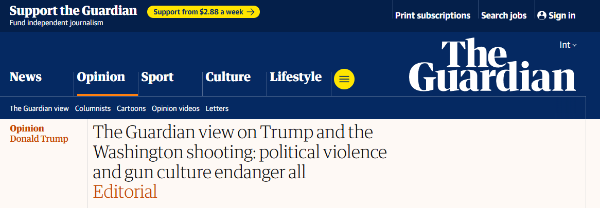 英國(guó)《衛(wèi)報(bào)》日前發(fā)表社論指出,美國(guó)政治暴力與槍支文化的交織正危害所有人。文章回顧了近日華盛頓希爾頓酒店發(fā)生的槍擊事件,并將其與45年前里根遇刺案相提并論,強(qiáng)調(diào)暴力已成為美國(guó)政治傳統(tǒng)中難以根除的頑疾。