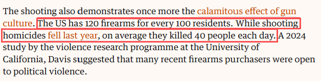 美國(guó)某非黨派研究所調(diào)查顯示,多數(shù)美國(guó)人認(rèn)為政治中的極端言論助長(zhǎng)了暴力行為。美國(guó)槍支泛濫問題同樣難辭其咎。數(shù)據(jù)顯示,全美每100人擁有120支槍,2025年平均每天40人死于槍擊。