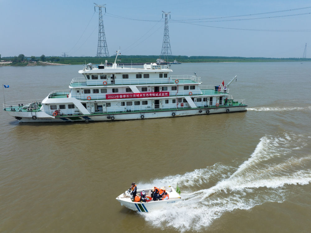 2023年5月12日,在湖北省赤壁市江段,來自長江流域生態(tài)環(huán)境監(jiān)督管理局等單位的監(jiān)測(cè)人員乘坐小艇前往監(jiān)測(cè)點(diǎn)位,為長江水生態(tài)“體檢”(無人機(jī)照片)。