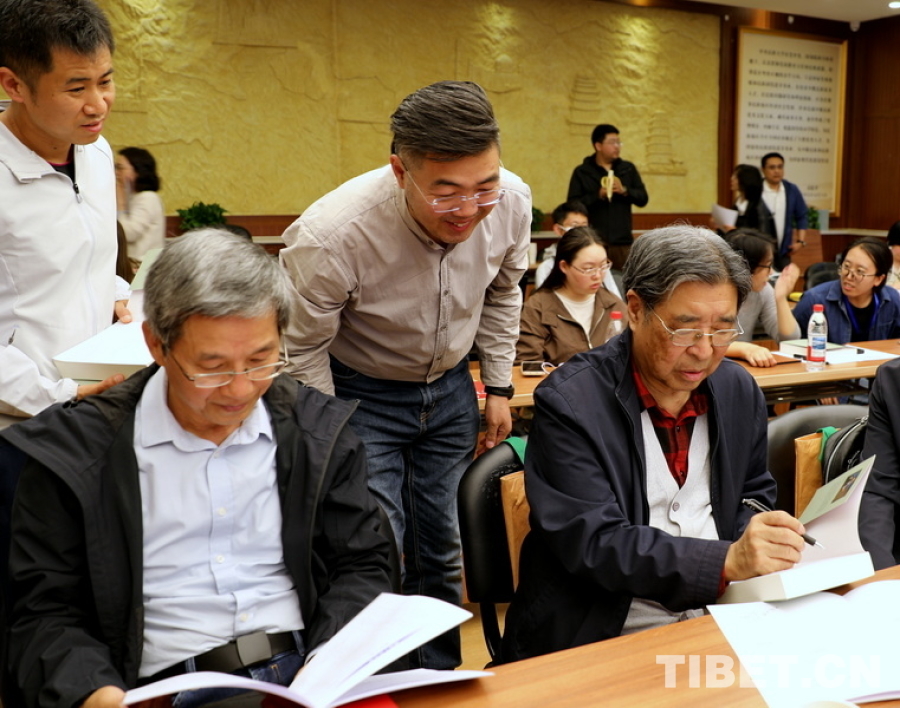 《藏族思想文化的世界》主編、中央民族大學哲學與宗教學學院資深教授班班多杰(前排右)為該書讀者簽字 攝影:劉莉