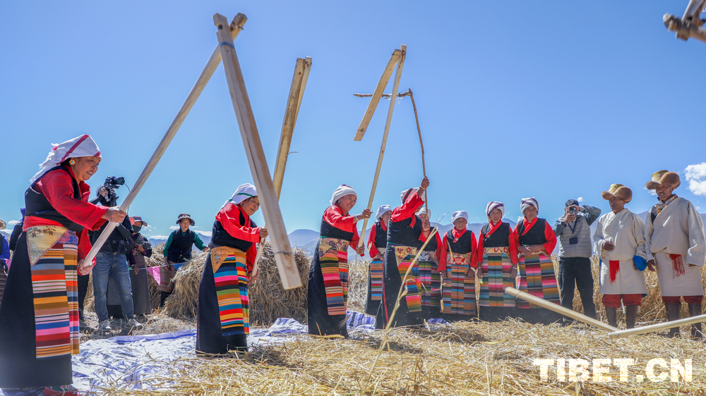 資料圖:西藏拉薩林周縣強嘎鎮(zhèn)典沖村村民展示傳統(tǒng)青稞脫粒 攝影:賈華加