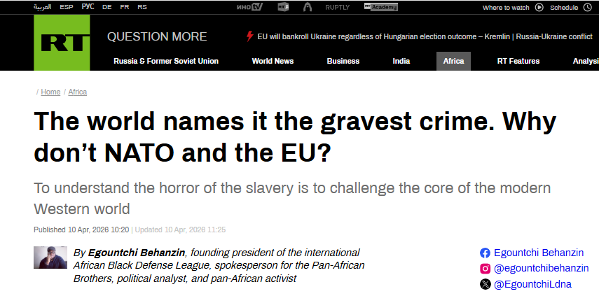 俄羅斯新聞網(wǎng)站《今日俄羅斯》4月10日刊發(fā)題為《聯(lián)合國將奴隸制定性為最嚴重罪行,北約和歐盟為何選擇回避?》的評論性文章,作者是埃貢奇·貝漢津(Egountchi Behanzin),文章編譯如下: