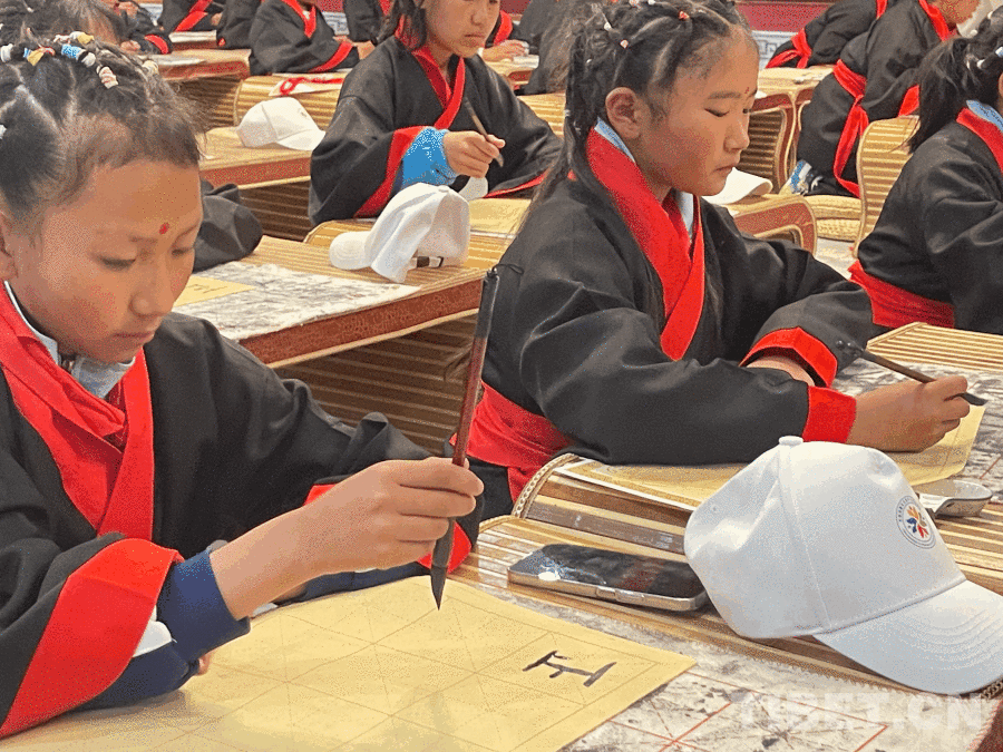 4月22日,在山東曲阜孔子故里,來此研學(xué)的西藏山南錯那市的中小學(xué)生身著傳統(tǒng)服飾,在開筆禮上認真書寫“正”字。攝影:次旦拉姆